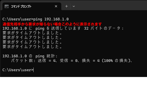 上記の例では相手先があり、応答が正常に返ってきていますが、応答がない場合もあります。下記の例では、通信相手先が存在していない、電源が入っていない、LANケーブルが抜けているなど考えられます。