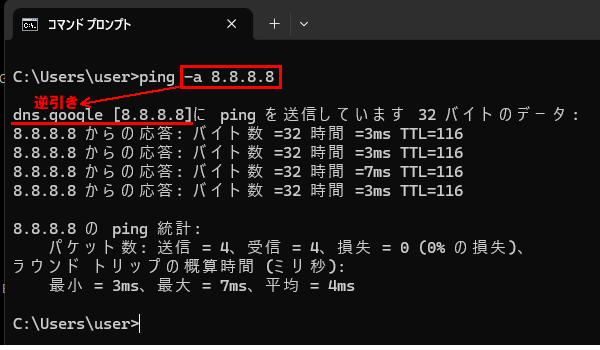 「-a」オプションをつけて名前解決できます。入力例として、ping -a 8.8.8.8 を入力してEnterキーを押下。名前解決されてgoogleの名前が表示されています。