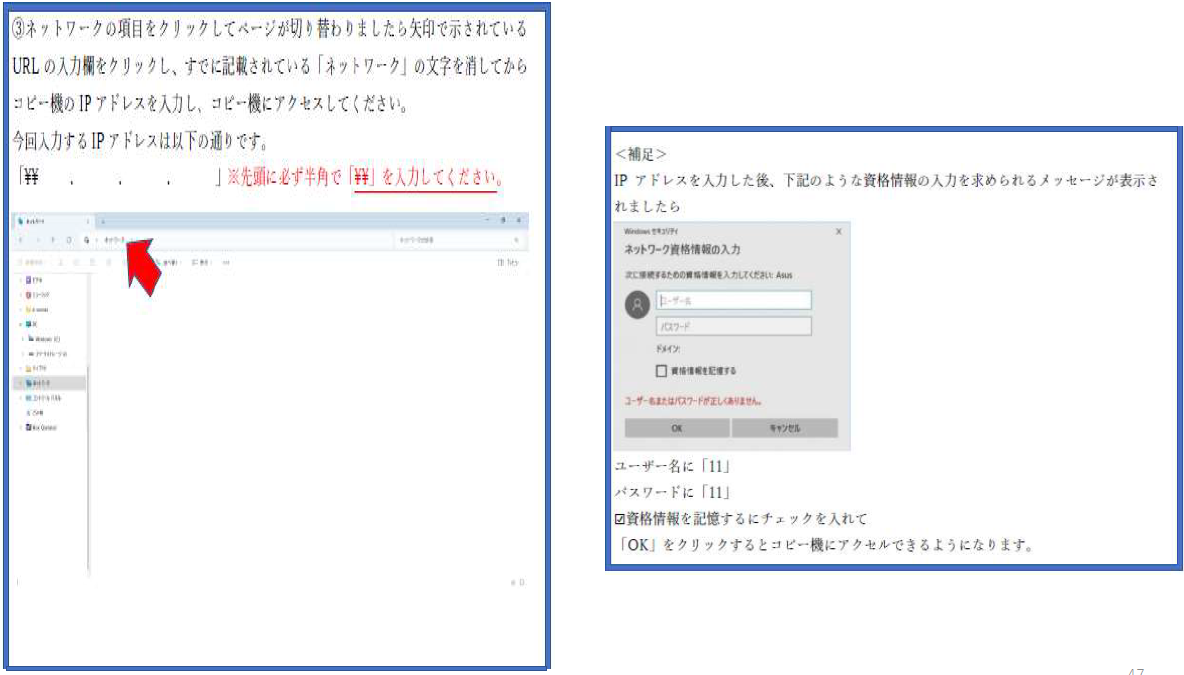 ③ネットワークの項目をクリックします。アドレスバーに「¥¥〇〇〇.〇〇〇.〇〇〇.〇〇〇」〇印のところには複合機のIPアドレスを入力して下さい。画面が展開し、資格情報の入力を求められたらユーザー名に「11」パスワードに「11」を入力して「OK」ボタンをクリックします。
