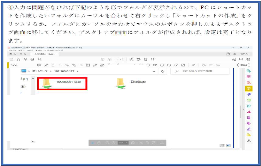④複合機に作成してあるフォルダーが表示されてきます。PCにショートカットを作成したい場合は、フォルダの上で右クリックしショートカットを作成します。