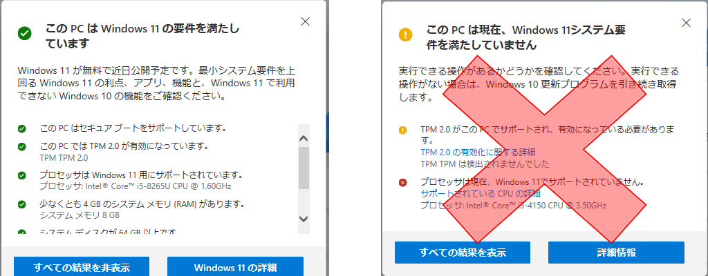⑤チェックが終わり画面に判定結果が表示されます。下記画像左側のような表示であれば問題ありませんが、右側のような画像の場合は、アップグレードできません。